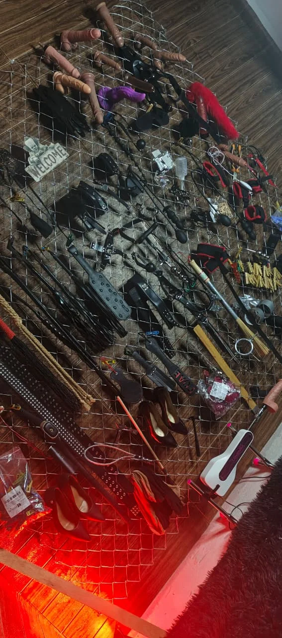 This is a space of absolute power. Every tool is hung with purpose, order, and precision. Nothing is here by chance. The atmosphere is thick, controlled, with leather, metal, and ropes that invite control without softness. There’s no play here, only discipline, hierarchy, and relentless dominance.