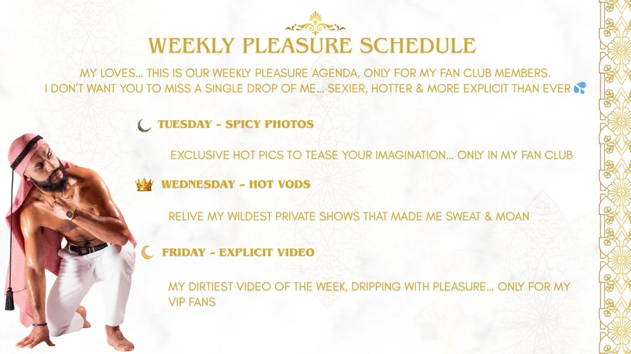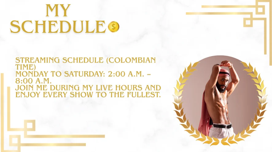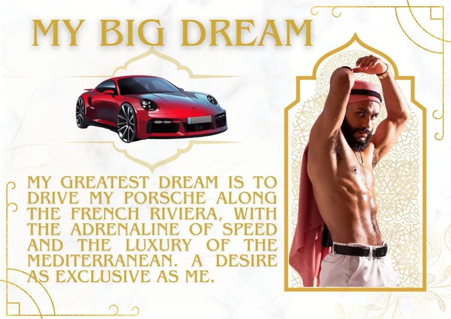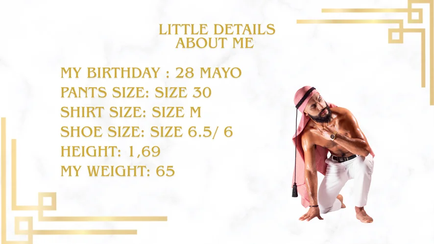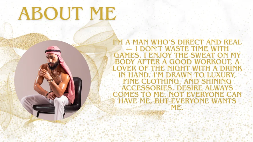 I love being the center of attention, showing off my sexy, worked body to satisfy every desire. I live fit, I read, and I'm always chasing the best version of myself. Sweat, lust, and hard cocks keep me hot and ready to play. I love jerking off and cumming for you, tasting my load, and getting even more turned on. In private, the real game begins. I want to see you, feel you, and turn up the heat in every Cam2Cam. I'll read your desire, control your pleasure, and make you beg for more. Your Arab Sheikh is waiting. come and worship me like your king