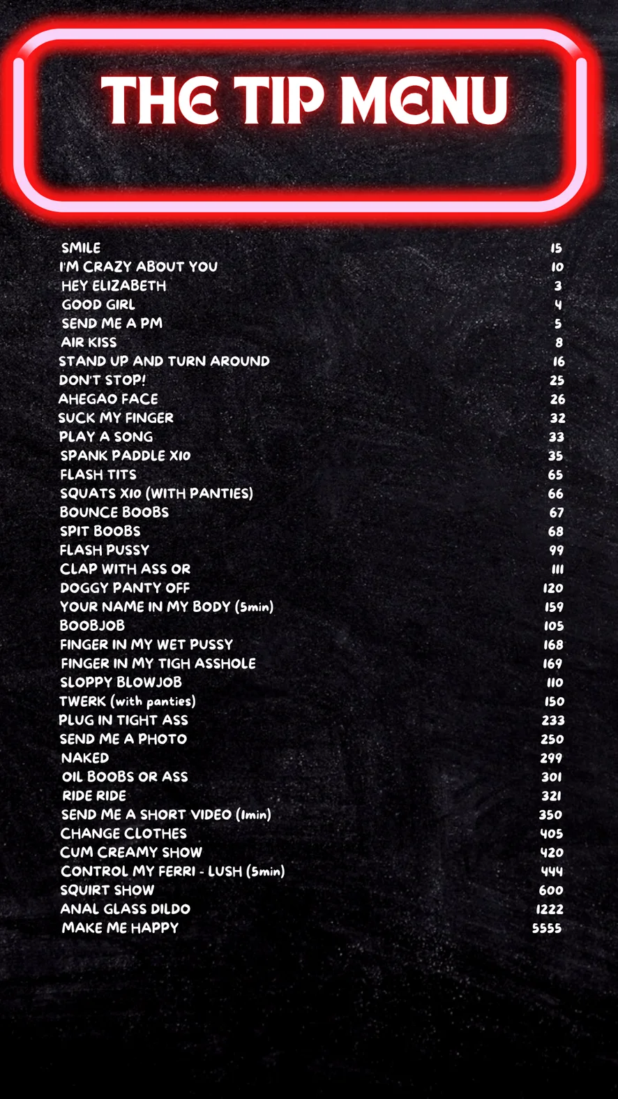 Doggy Style, Ahegao, Spanking, Camel Toe, Erotic Dance, Dirty Talk, Facesitting, Foot Fetish, Fingering, Striptease, Humiliation, Role Play, Nipple Toys, Blowjob, Masturbation, Tittyfuck, Oil Show, Heels, Twerk, Dildo or Vibrator, Deepthroat, Jerk-off Instruction, Anal Toys, Sex Toys, Squirt, Hardcore, Topless, Cowgirl