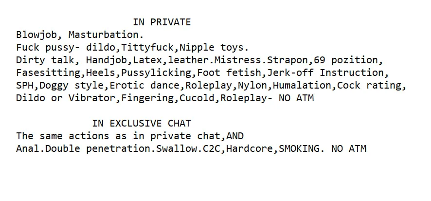 Flashing, Cowgirl, Erotic Dance, Doggy Style, Nylon, Twerk, Topless, Striptease, Dirty Talk, Nipple Toys, Blowjob, Handjob, Latex, Leather, Mistress, Strapon, 69 Position, Facesitting, Heels, Foot Fetish, Jerk-off Instruction, Anal, Anal Toys, Dildo or Vibrator, Fingering, Humiliation, Hardcore, Smoking, Masturbation, Cuckold, Double Penetration, Role Play, Tittyfuck